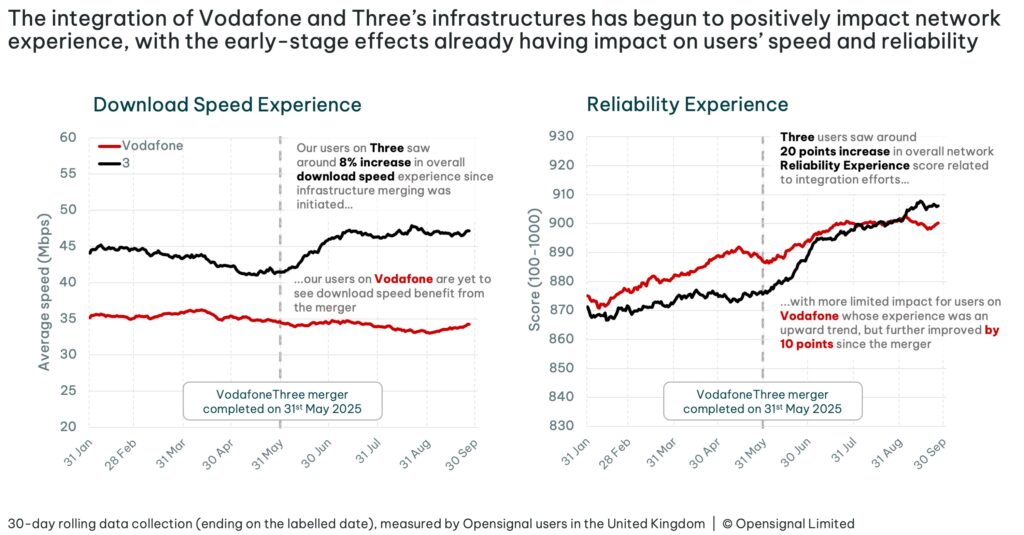 Post-merger, Vodafone and Three users are already experiencing improved reliability in areas of existing coverage, while Three users are also measuring improved download speeds. Importantly, Opensignal found that the merged entity’s network is not only resulting in better coverage, but better experience in already covered areas.